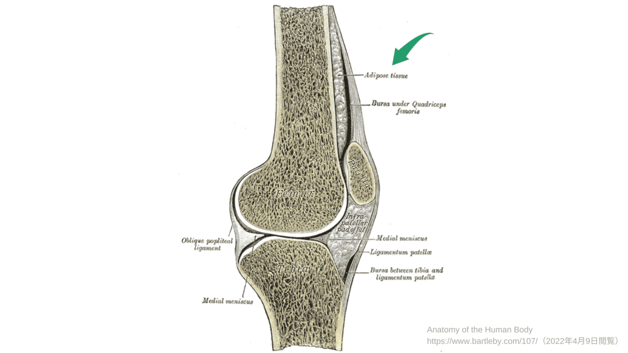 膝蓋上嚢よりも深層で、大腿骨との間に存在する脂肪組織です。prefemoral fat pad(PFP)と呼ばれることも多いです。