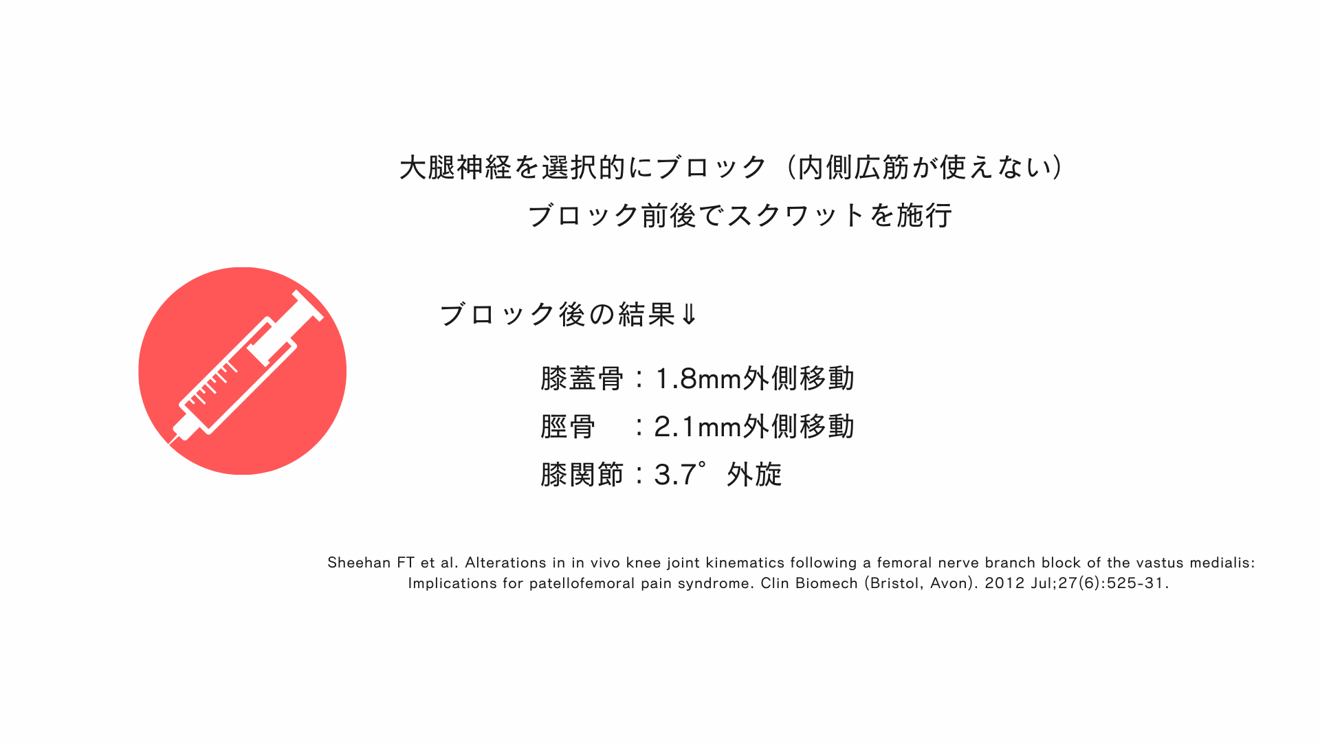 これが結果的に摩擦を生じさせ、疼痛を惹起するという流れも大いに考えられますので、これを未然に防ぐという意味で早期からの内側広筋の促通は必要だと思います。