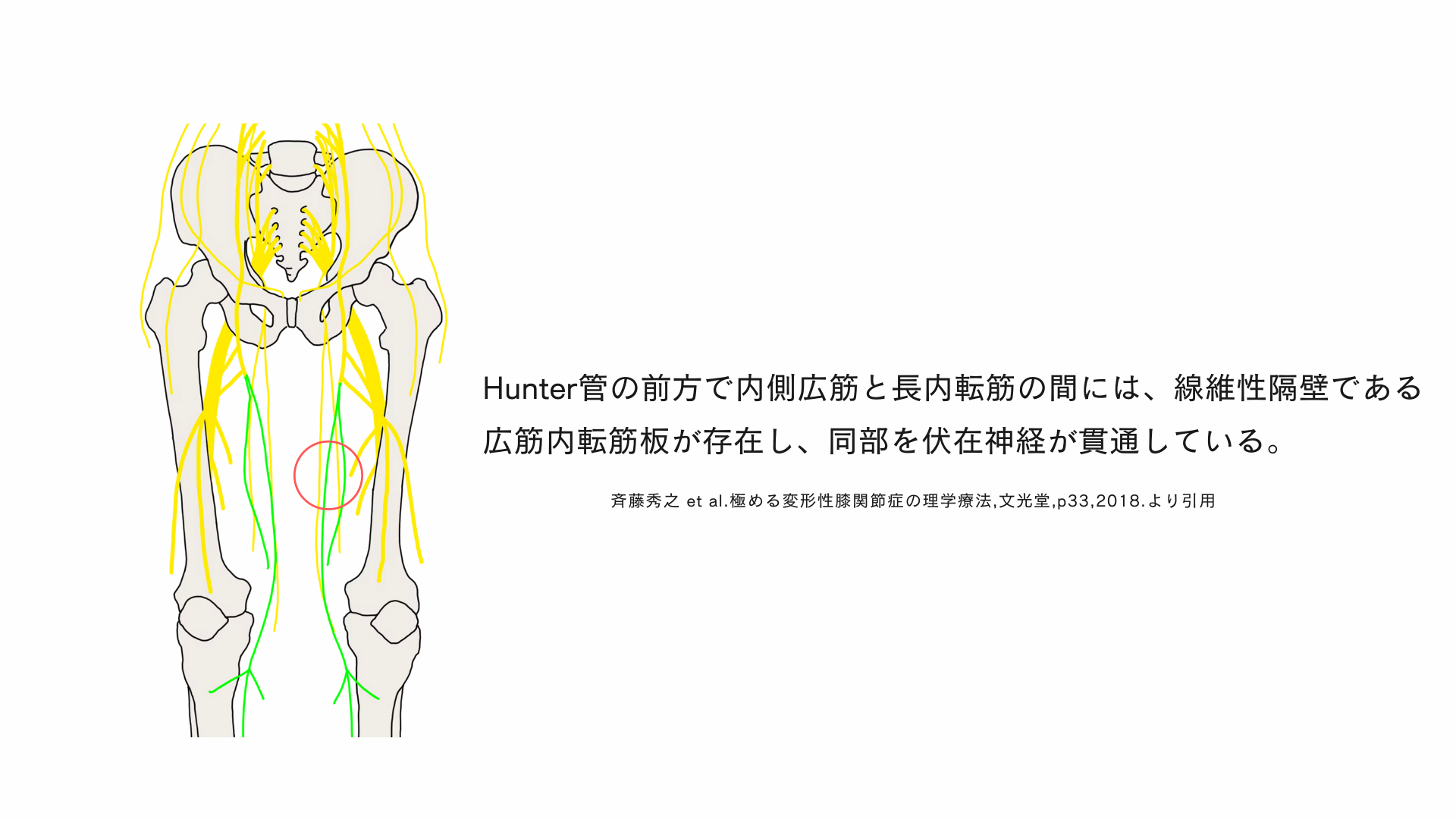 ちなみに伏在神経絞扼はこの広筋内転筋板での絞扼のみならず、縫工筋が関与していることも多いため、その部分の精査は怠らないように留意して頂けるとよいかと思います。